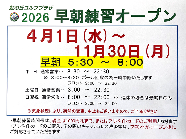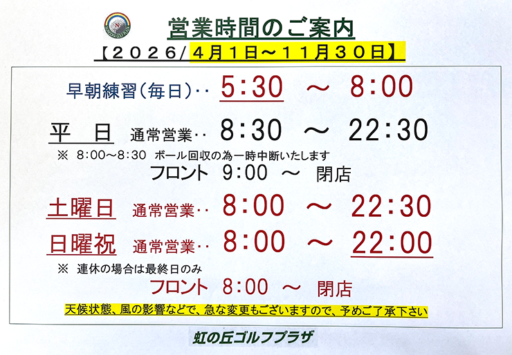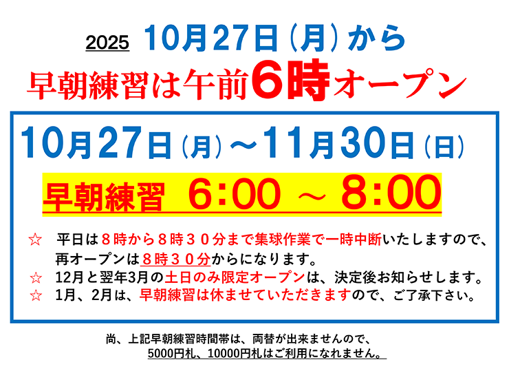 終日 午前8時開店、午後11時閉店となり、早朝練習は11月30日(日)を持って、冬期お休み期間に入ります。