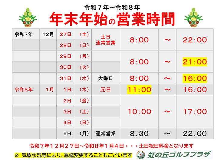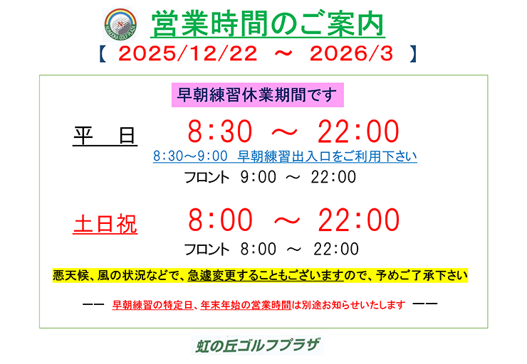 冬期営業時間と早朝練習お休み期間のお知らせ